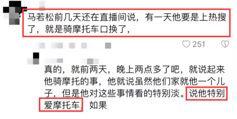 据了解,事发前一天,马若松还照常开直播与网友互动,声称自己是家中独子,暗指父母对他极为珍视,但因为酷爱摩托车,他自己将这些事情反而看得很淡,似乎是冥冥中早有预料,马若松在直播中还笑称自己如果有一天上了热搜,那就是骑摩托车太快出事了。