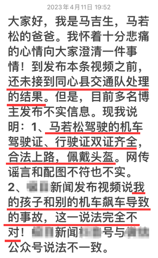 马爸爸明确表示儿子马若松的事故调查结果尚未公布,但外界已经流传了诸多涉嫌污蔑儿子的不实谣言,马爸爸为此作出说明,表明马若松并非所谓的无证驾驶,事发当天也是合法上路,也按照交规佩戴了头盔。