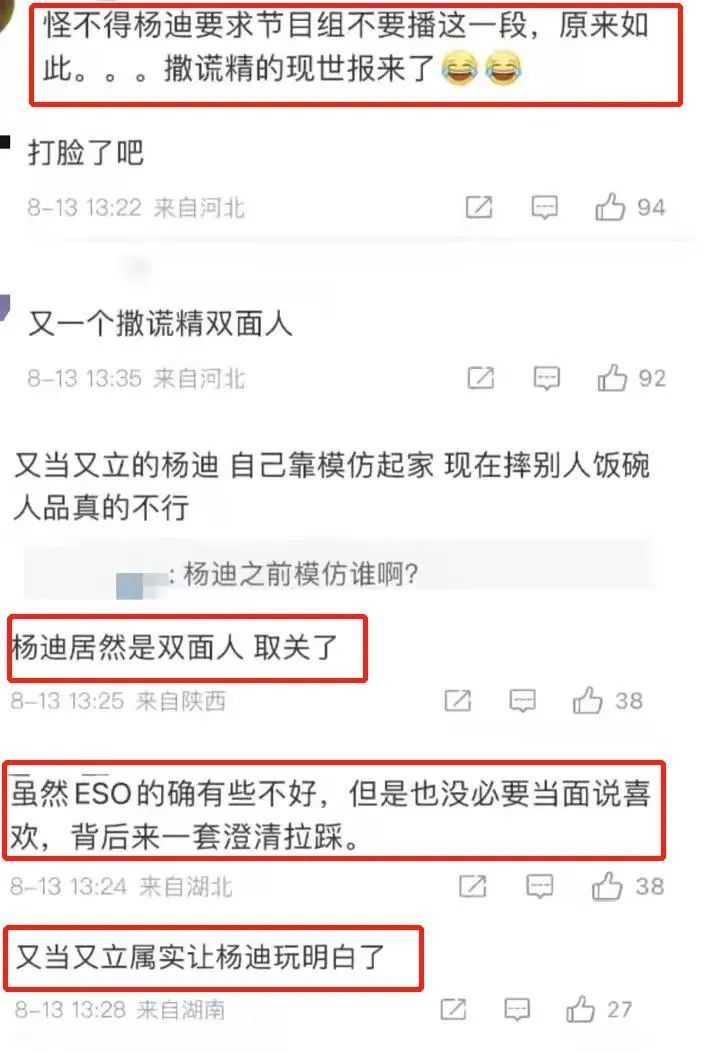 杨迪当面夸赞,背后踩ESO的行为也让网友们批评他是“又当又立”,这时他被认为是“双面人”,路人缘已经岌岌可危。