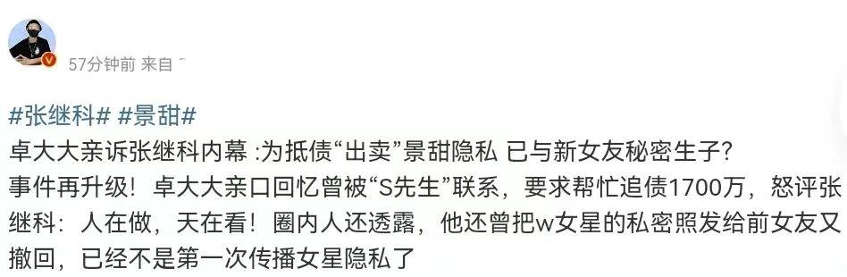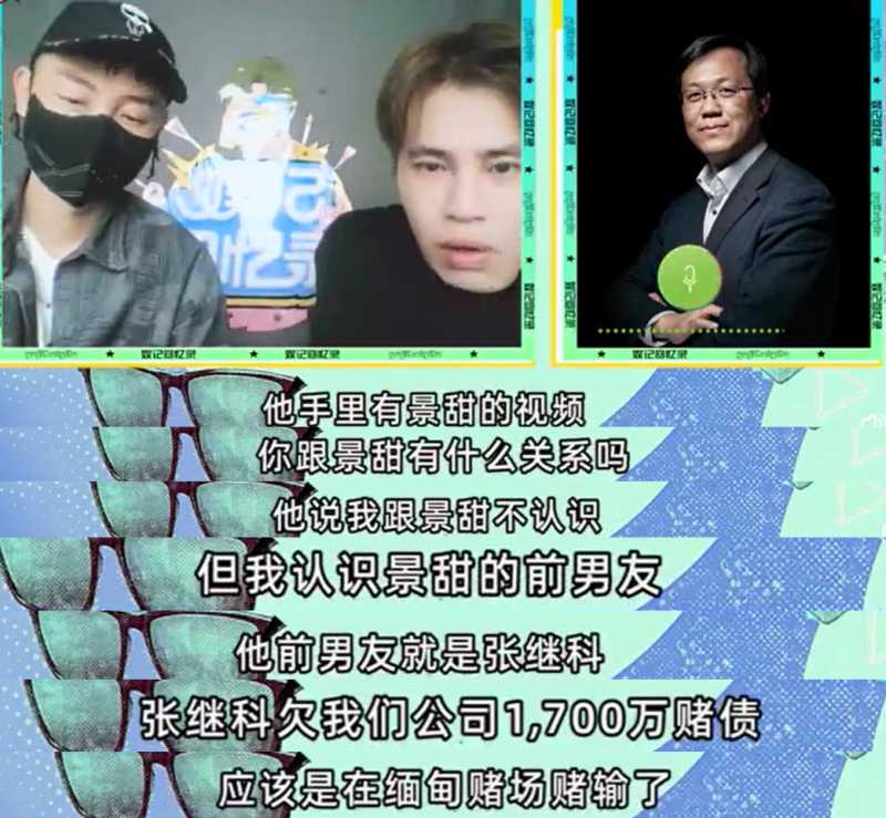 债主很明确的表示,张继科说自己还不上这个钱,但是可以找自己的前女友景甜要,债主问景甜凭什么给钱,张继科说:“我给你点东西。”这个所谓的“东西”就是指景甜的两条视频了。