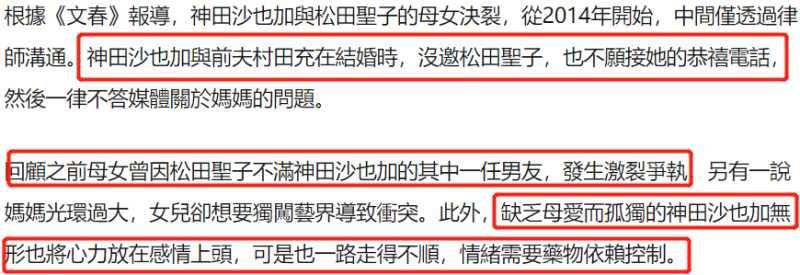 神田沙也加是知名星二代,母亲松田圣子和父亲神田正辉均是日本知名明星,仍活跃在娱乐圈,只是双方早就离婚,神田沙也加与母亲松田圣子关系很是一般,特别是针对神田沙也加的感情生活,母女俩时常爆发争吵。