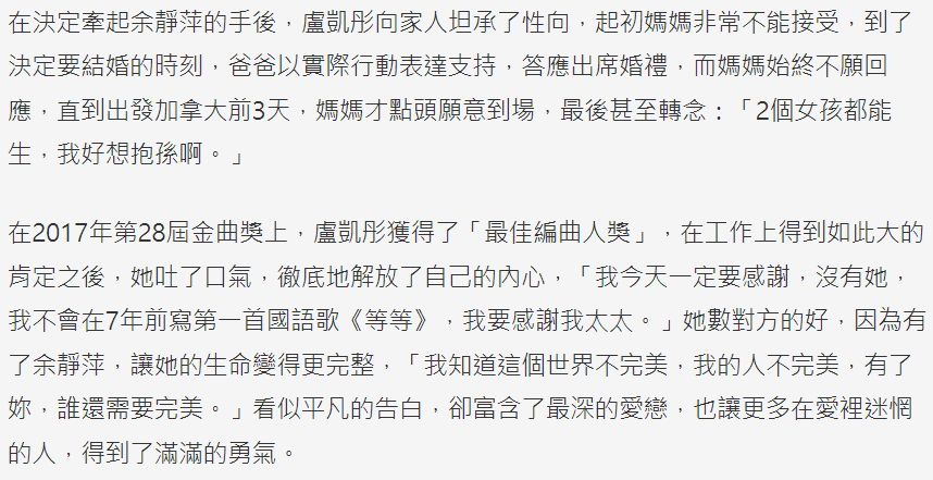 卢凯彤也曾经经历过苦难,但已得见曙光,她获得了金曲奖,并在颁奖礼上勇敢和同性爱人表白,二人爱情甜蜜,相爱9年累积了700封情书。