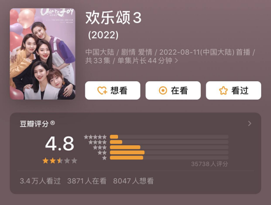 《欢乐颂3》的评分在4.8分,这个分数基本上可以称得上是烂剧了,原以为这一系列就在这里停止了,没想到剧方还是不肯放弃这个大流量,又拍了《欢乐颂4》或者可以说《欢乐颂3》的续集。