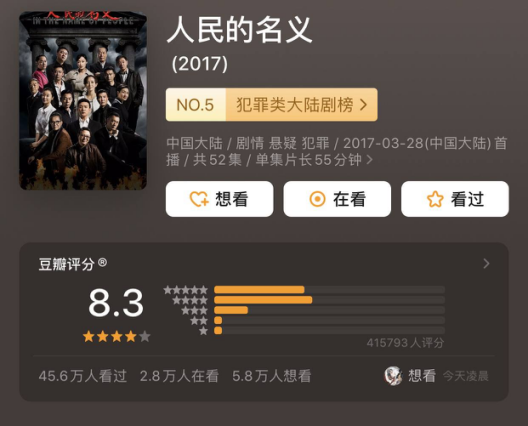 然而,《突围》悄无声息地扑了,播出后根本没有掀起多大的浪花,最后的评分也只有5.2分。《人民的名义》之所以可以成功,剧本、演员、观众缺一不可,不是说拍类似的题材就可以复制同样的成功。