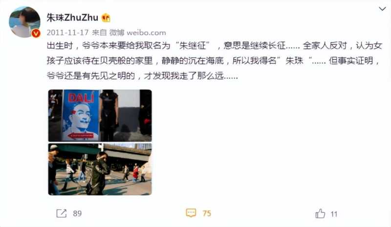 据说,朱珠出生时,爷爷想给她起名“朱继征”,意思是继续长征的意思,但遭到了全家人的反对,家里人觉得这个名字不太适合女孩子,后来便取了朱珠这个名字,寓意“掌上明珠”。