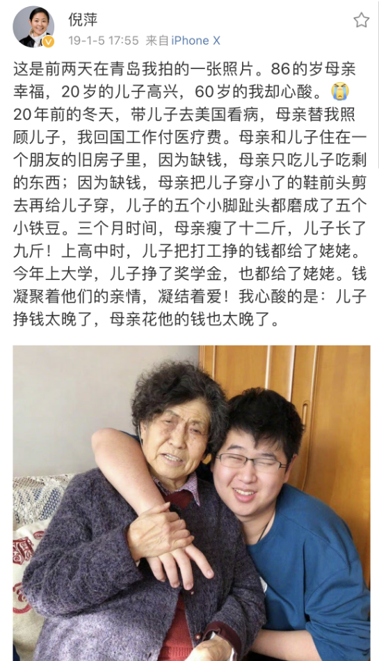 还记得早年期间,倪萍曾讲述带儿子出国看病一事,当时倪萍还把母亲带在身边,因为缺钱母亲只能吃儿子剩的东西,三个月母亲瘦了12斤,回忆这些过往倪萍内心很心酸,在倪萍最困难、最贫穷的时候,也只有母亲陪在她身边,可以想象母女二人之间的感情有多深,倪萍的儿子和姥姥的感情也很深,挣了奖学金也都给了姥姥。