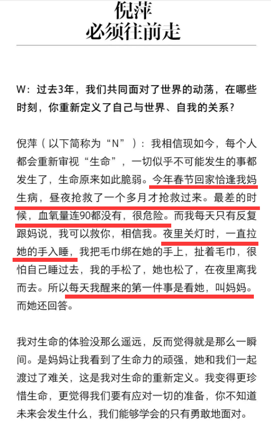 倪萍告知母亲是在今年春节期间生病,恰好她回家过节,母亲昼夜抢救了一个多月才抢救过来,最差的时候血氧量连90都没有,非常危险。