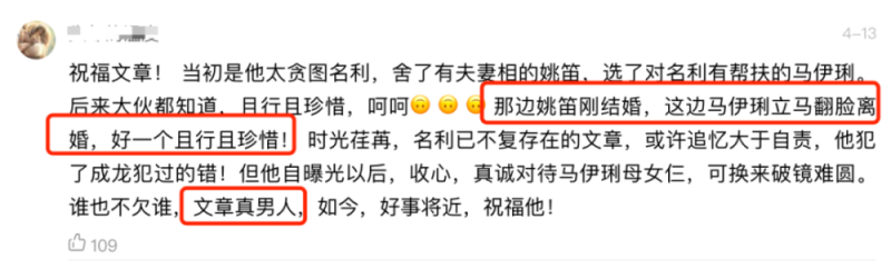 让人意外的是,大家在祝福文章的同时,还会踩一脚马伊琍,说她“有心机”“等姚笛结婚才跟文章离婚,自己不要的,也不让别人得到”。
