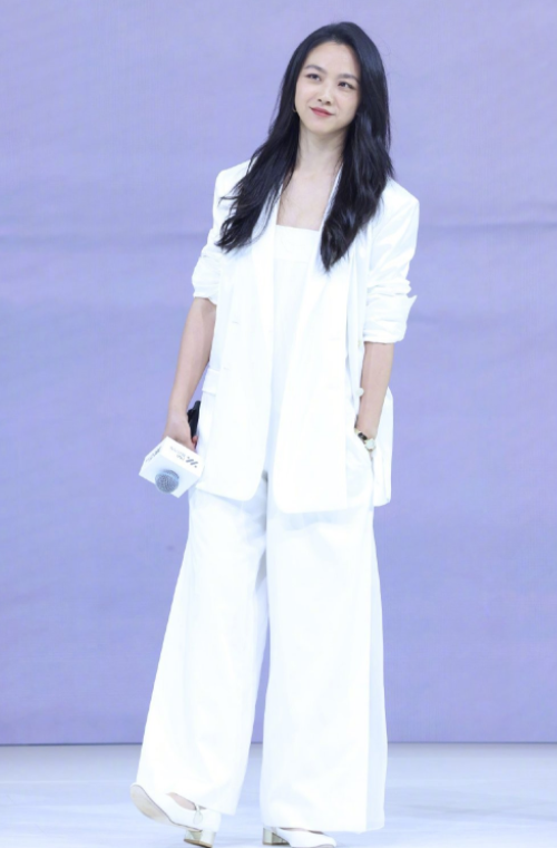 在今天,汤唯出现在上海某车展的活动现场,一身白西装+白色高跟鞋,再加上大高个儿,气场全开,身上有一种特别干练的气场。