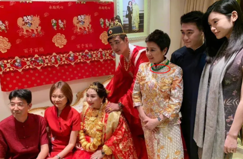 当时的赌王四太梁安琪也是穿着一件龙凤褂,脖子上戴着一条翡翠项链,和三太的穿搭很相似。
