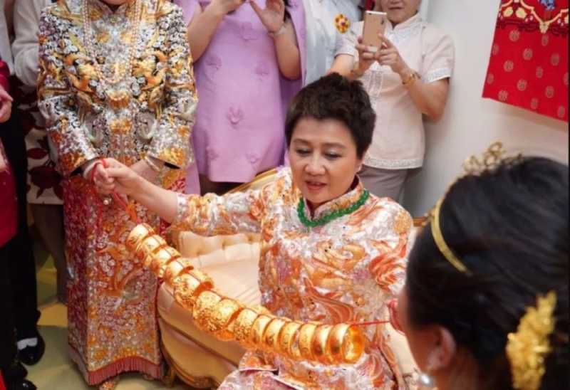 最令人印象深刻的就是“过大礼”场面,几乎堆满了一个客厅的珠宝,贵价食材等等,还有何超盈身上挂满的金器,都十分有排面。