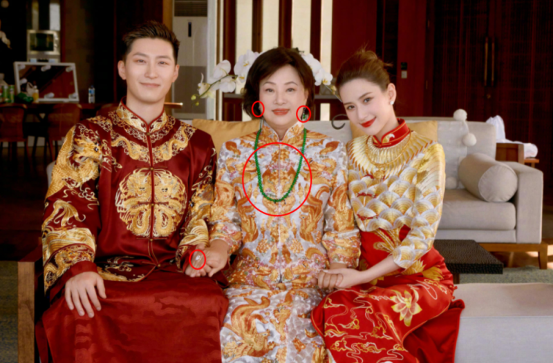 当然,最亮眼的还是三太身上的珠宝首饰,除了鸽子蛋钻石戒指,最有看头的就是脖子上的项链和手镯,有网友猜测是“帝王绿”,一套下来可能要上亿。