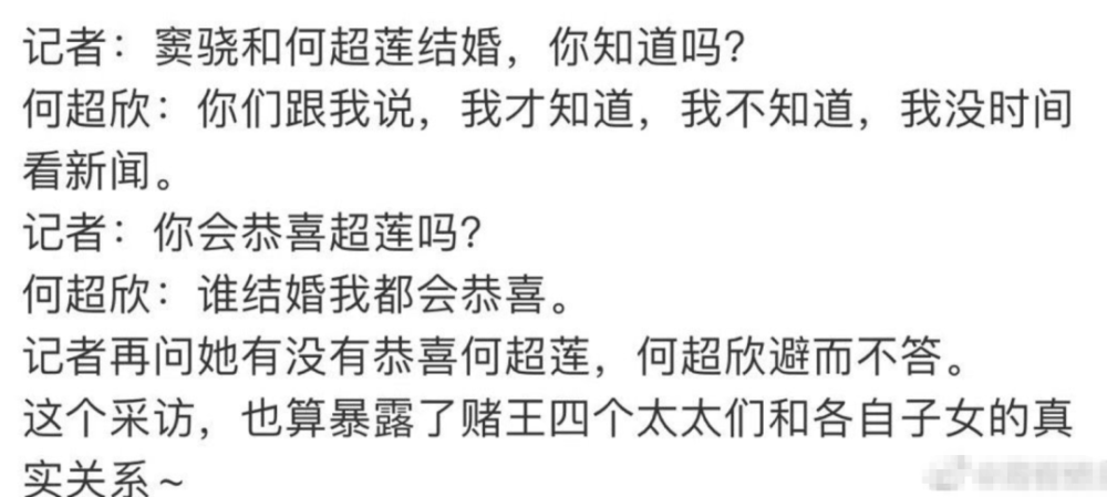 四房的小女儿何超欣日前的一则采访也在这个时候被网友翻出来了,在何超莲结婚前夕,有记者去问何超欣,知不知道何超莲和窦骁要结婚了。何超欣表示自己不知道,没时间看新闻,记者说了才知道的。