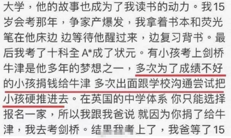 何猷君的长文中本意是想表达自己为了赌王的心愿,努力凭借自己的本事考上了剑桥大学的自豪,但却在里面提到了赌王早年花钱想让子女上牛津大学的事情,只要网友们仔细分析赌王几房子女的情况,就能轻易得知何猷君口中“花钱上大学”的是三房子女。