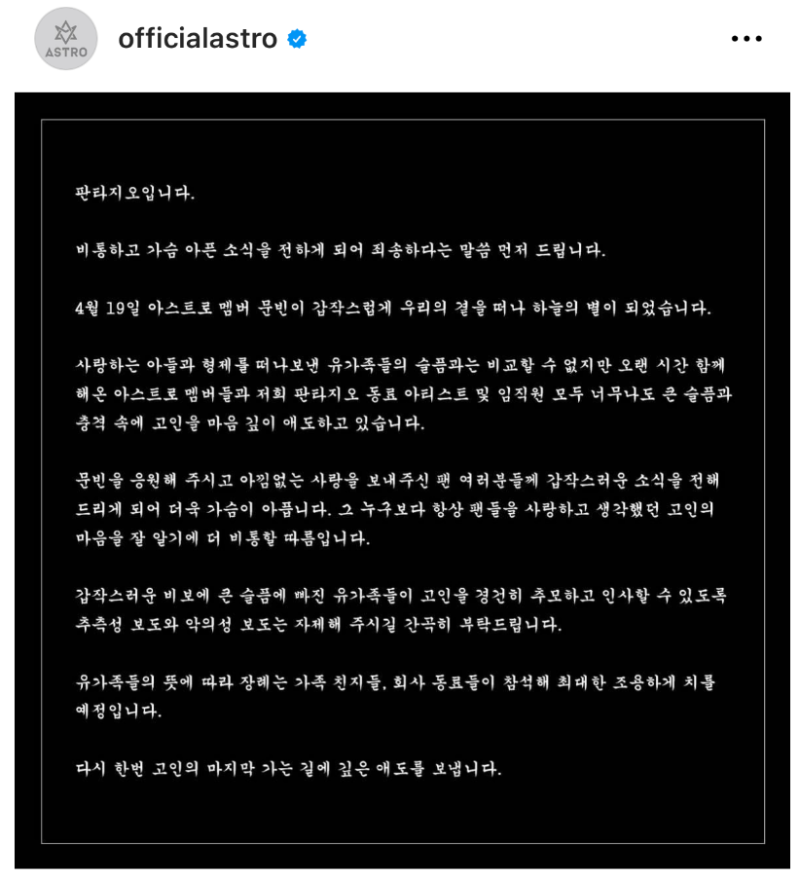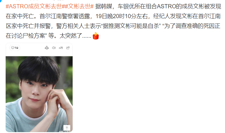 4月19日晚,韩国ASTRO组合成员文彬被经纪人发现在家中去世,据警方透露,文彬死亡的时间是19日晚8点10分左右,初步推测是自杀,具体死因要等尸检后才能得知。