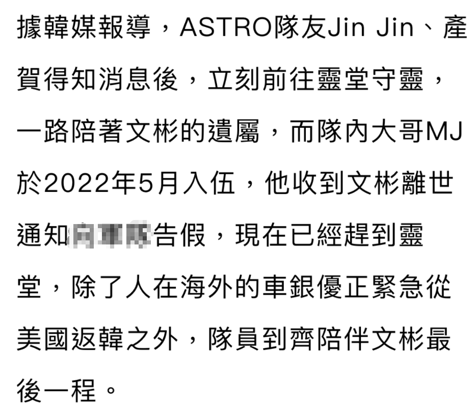 ASTRO组合的另外一位成员金明俊当下正在服兵役,在听闻噩耗之后,便主动申请紧急休假,第一时间赶往文彬的灵堂,此外其他成员朴真祐和尹产贺已经到达灵堂予以吊唁。