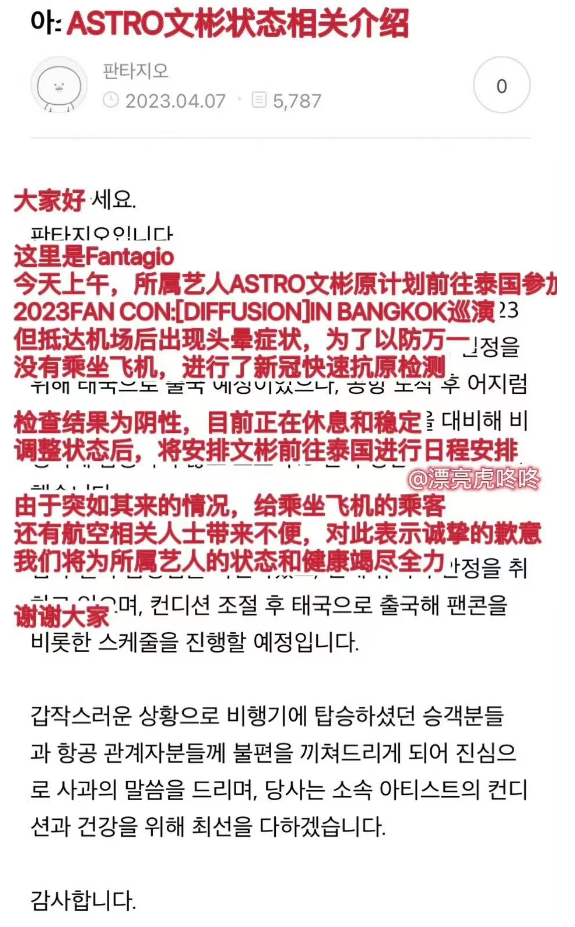 而在4月7日,ASTRO所属公司曾发布通告,声称文彬出现了头晕等身体不适的症状,还第一时间进行检测企图查明原因,在排除感染的可能之后,公司方暂时允许文彬暂停工作,稍作休养与整顿后再重新出发。