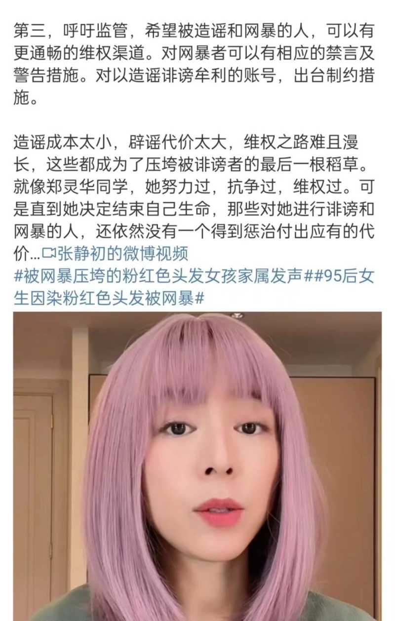 作为有着同样被网暴经历的人,张静初感触很多,她将头发弄成粉色,为郑灵华发声。呼吁勇气,希望被网暴的人能拿出勇气战胜它。呼吁善意,不明真相之前,请网友不要随意评论,伤害别人。呼吁监管,希望被造谣和被网暴的人,可以有更多流畅的渠道维权。