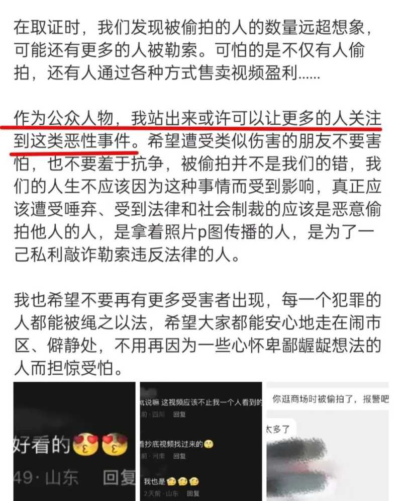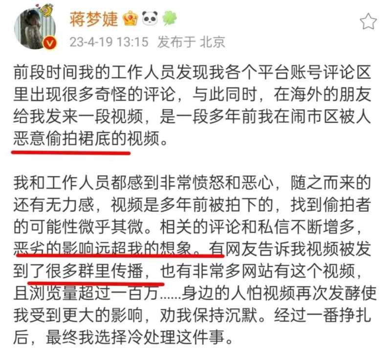 近日,女星蒋梦婕发文,讲述了被偷拍的经历,她说在多年前她被恶意偷拍裙底,还面临着威胁和勒索,罪犯扬言如果不给钱,就要毁了她的演艺事业。