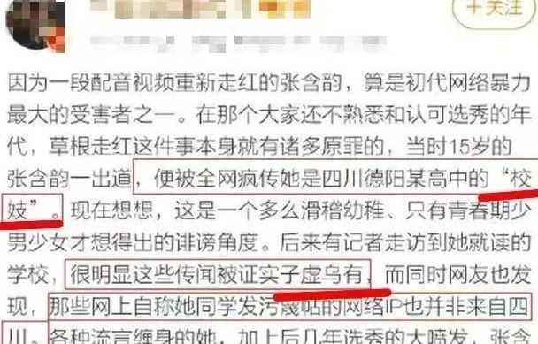 通过“超女”走红后,有人冒充是她的同学,给她泼脏水、造谣,称她在学校风评很差,还有家长过来说她会教坏学生,面对铺天盖地的谩骂和侮辱,张含韵无奈之下选择了退学。