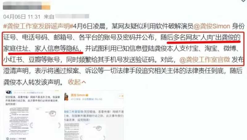 尽管如此,舆论并未停止,“龚俊与白马会所”等相关词条冲上热搜。有人疑似利用软件,破除龚俊社交账号的密码并公布,随后多名网友“人肉”搜索龚俊,找到他的家庭住址,家人信息等隐私,并频繁给其手机号发送验证码,给龚俊带来了很大的困扰。