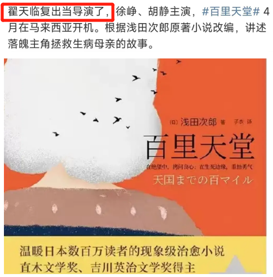 据爆料,翟天临复出执导改编短剧《百里天堂》,主演徐峥、胡静,该电影已在马来西亚4月开机。