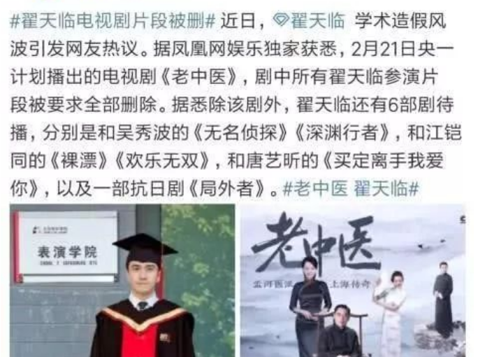 翟天临学术被打假后,也付出了一定的代价,被官方通报,被舆论软封杀。待播的6部作品里,《老中医》火速删减翟天临镜头,其他5部播出遥遥无望。