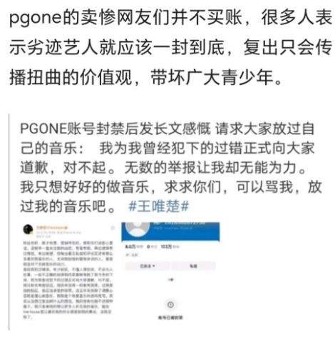 其实近期PGONE的复出失败,就已经说明了大家的态度。娱乐圈不缺明星,缺少的是正能量的偶像,如果让这些劣迹艺人复出只会传播扭曲的价值观。