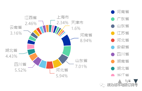 观察全国各省份门店数量统计占比可知:河南省门店数量占比最大,其次是广东省、山东省、江苏省。