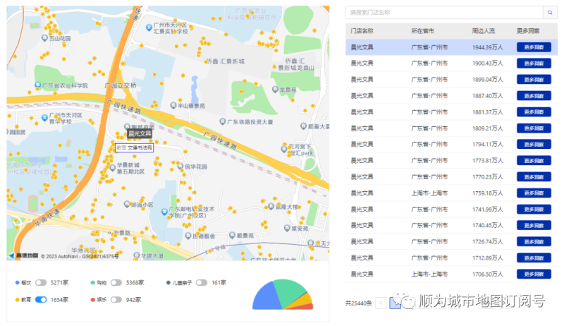 以晨光品牌文具店举例,在平台上我们可以查询到品牌概况、品牌分布、店铺周边人口画像,还可以洞察门店商圈。