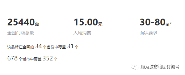 这个品牌在全国有 25440 家门店,在全国 34 个省份中覆盖了 31 个,在 678 个城市中覆盖了 352 个;门店的人均消费为15元,店铺的面积要求在 30--50 m²。
