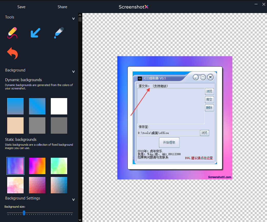 除了背景设置,它还可以对截图添加涂抹、高亮、模糊、箭头,支持从屏幕截图中检测任何像素的颜色代码。