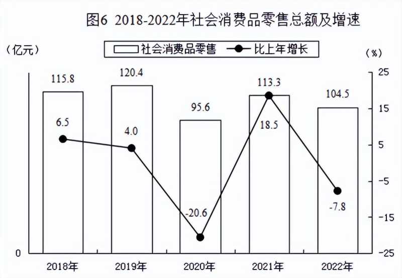 全年实现社会消费品零售总额104.5亿元,比上年下降7.8%,扣除价格因素,实际下降9.6%。按经营地统计,城镇消费品零售额103.3亿元,下降8.0%;乡村消费品零售额1.2亿元,增长16.7%。按消费类型统计,商品零售额95.6亿元,下降7.5%;餐饮收入额8.9亿元,下降10.5%。