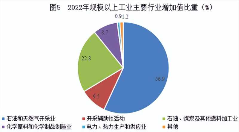 在支柱行业中,石油和天然气开采业增加值比上年增长3.0%;开采辅助性活动增加值比上年增长2.1%;石油、煤炭及其他燃料加工业增加值比上年增长9.1%;化学原料和化学制品制造业增加值比上年增长7.8%;电力、热力生产和供应业增加值比上年增长3.3%。