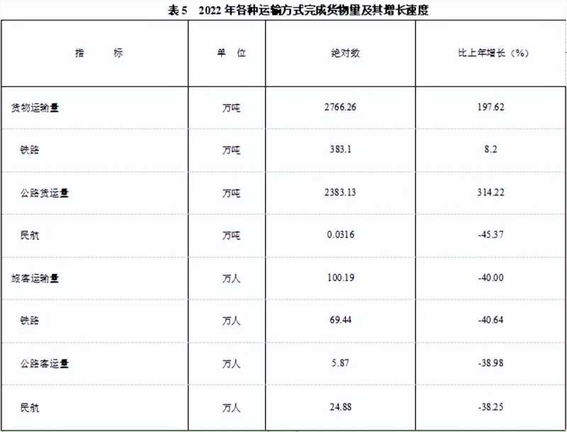 全年货物运输量2766.26万吨,比上年增长197.62%。旅客运输量100.13万人,下降40.04%。