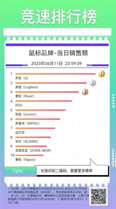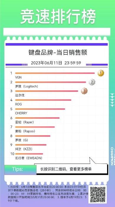 在键鼠产品之中,大品牌对消费者的吸引力显著。罗技(G)成为消费者最认可的鼠标品牌,名列鼠标品牌当日销售额榜第一,罗技与雷神紧随其后获得鼠标品牌榜的第二、三名。在办公鼠标的选择上,实力非凡的VGN成为办公鼠标品牌当日销售额榜单冠军,罗技其次,罗技(G)则排名第六。此外也不难看出,消费者在办公、游戏等场景中,对键鼠有着不同要求,但在品牌的选择上却是一致。其中,VGN成为办公鼠标品牌和键盘品牌当日销售额两大榜单6月11日冠军,在这两大键盘榜单上,罗技、达尔优均位列第二、三的位置。