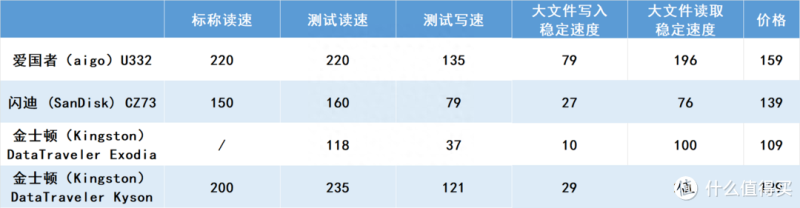 1、软件测试数据都能满足标称速度,最好的是爱国者U332和金士顿Kyson,读速能到200MB/s,写速都能上100MB/s;