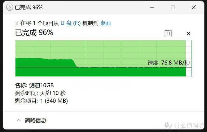 写入测试中,10GB文件在前1G左右能到90MB/s,之后下降到29MB/s左右稳定传输。
