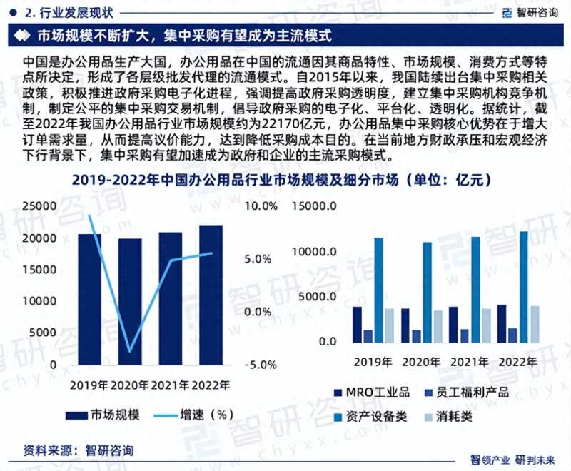 据统计,截至2022年我国办公用品行业市场规模约为22170亿元,办公用品集中采购核心优势在于增大订单需求量,从而提高议价能力,达到降低采购成本目的。在当前地方财政承压和宏观经济下行背景下,集中采购有望加速成为政府和企业的主流采购模式。