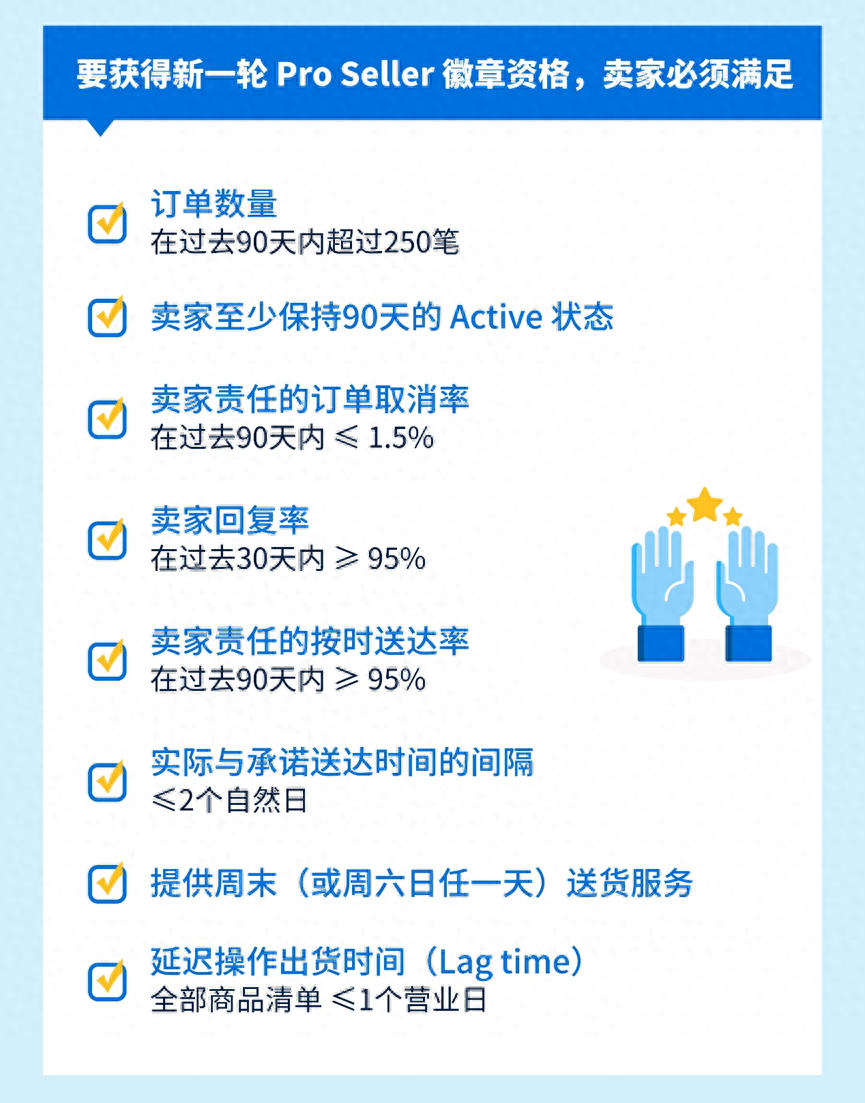 沃尔玛宣布,新的专业卖家徽章获取标准将更加严格,卖家准时交货率需要提高,卖家发起的订单取消率需要降低;同时,在过去的30天内卖家回复率要超过95%,并且不违反信任与安全或绩效标准;此外,沃尔玛还要求获得徽章的卖家在两天内交付订单,将处理时间控制在一个工作日以内,并设置周末送货。