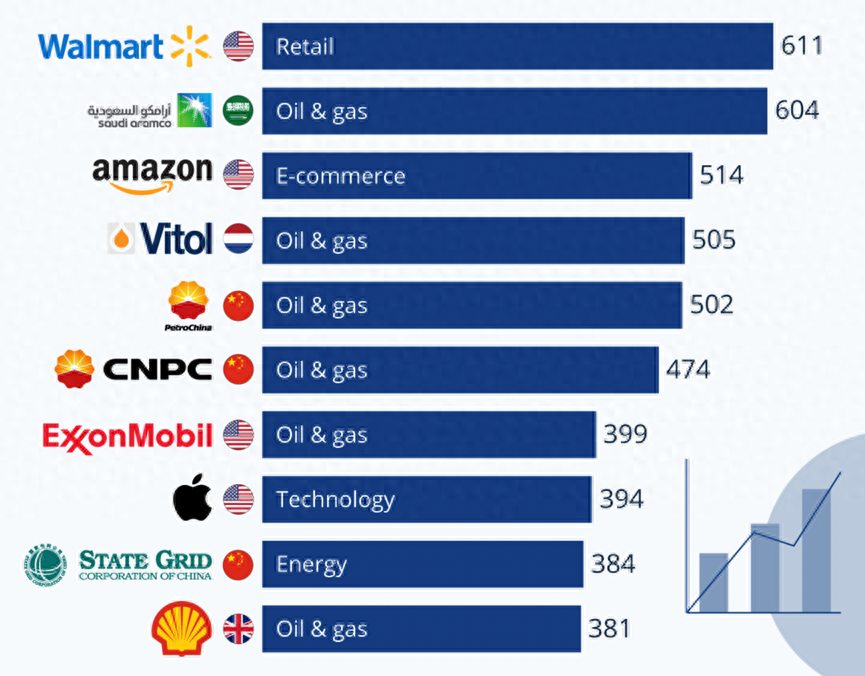 具体来看,在营收排行榜前十中,只有沃尔玛、亚马逊和苹果不是能源公司。身为零售公司却能登顶营收榜,足以证明沃尔玛商业表现的强势,即使是电商霸主亚马逊,营收也落后沃尔玛约1000亿美元,排在第三位。