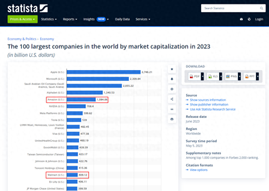 而在Statista近期公布的全球公司市值排行榜上,沃尔玛排在第16位,亚马逊位于第5位。股市排名和营收排名不一定匹配,不过值得注意的一点是,在市值排行榜上,亚马逊被列为非必须消费品公司,沃尔玛则被列为必须消费品公司。仅一字不同,就能体现出两家公司业务上的差异,也能解释为何沃尔玛始终稳坐营收榜榜首。