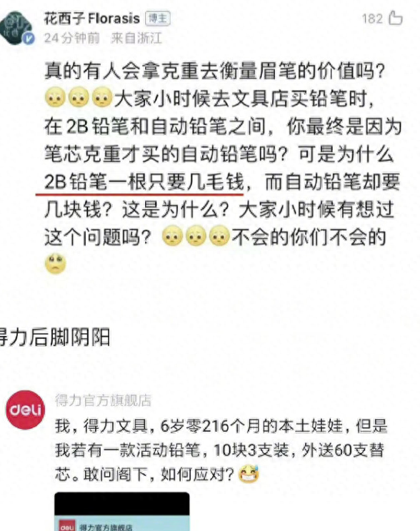 前段时间,李佳琦直播卖花西子79元1支眉笔的事件热度刚降下去一点,花西子今日又跳出来营销,想通过对比2B铅笔和自动铅笔的价格来表示不能用克重来衡量眉笔的价值。没成想,网友们并不买账!