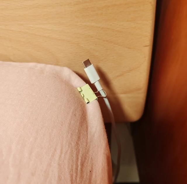 用一个小一点的燕尾夹就能搞定。夹在床垫的边沿,夹好后取走一个环,更好收纳拿放数据线,方法简单,但真的好用。 @DX3906