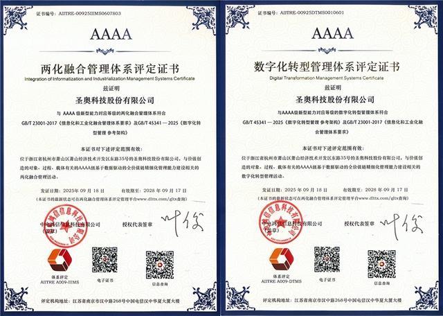 圣奥自2018年起实施“1+N”数字化战略,以数据中台为核心构建全链路业务平台。2023年升级“双中台”战略,使得业务调整更加灵活迅速。“一键报价”“一键下单”“一键生产”“一键报修”等数字平台,推动业务流程全面智能化。凭借在数字化领域的深度实践,圣奥成为全国首批、浙江省唯一获得企业两化融合管理体系3.0与数字化转型管理体系4A等级认证的企业,为行业数字化转型提供了可复制的“圣奥方案”。