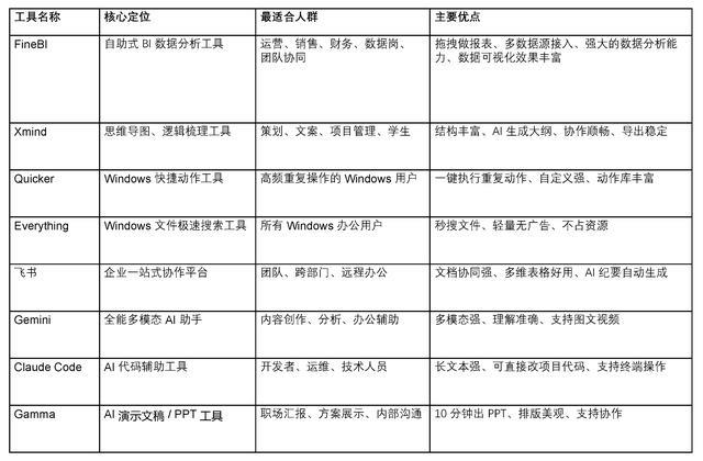 如果你是销售、运营、财务,每天要做报表、整理数据,优先学 FineBI,搭配 Everything 找文件,效率直接翻倍。经常写方案、理逻辑,Xmind 是必备,配合飞书做团队协作,思路清晰不混乱。经常做汇报、赶 PPT,Gamma 搭配 Gemini,快速出内容、优化排版,不用熬夜加班。技术岗就额外使用 Claude Code,辅助代码编写,工具按需选择即可。