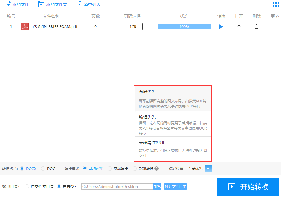 转换效率高、精确度好虽然它的转换格式有很多种,但却丝毫不影响它的转换速度及转换效果,9页的PDF文件,基本3秒即可全部转换完成,在下面的转换偏好设置中,有一个云端精准识别,这是提高转换精确度的选择,在复杂的文件都能做到1:1还原。