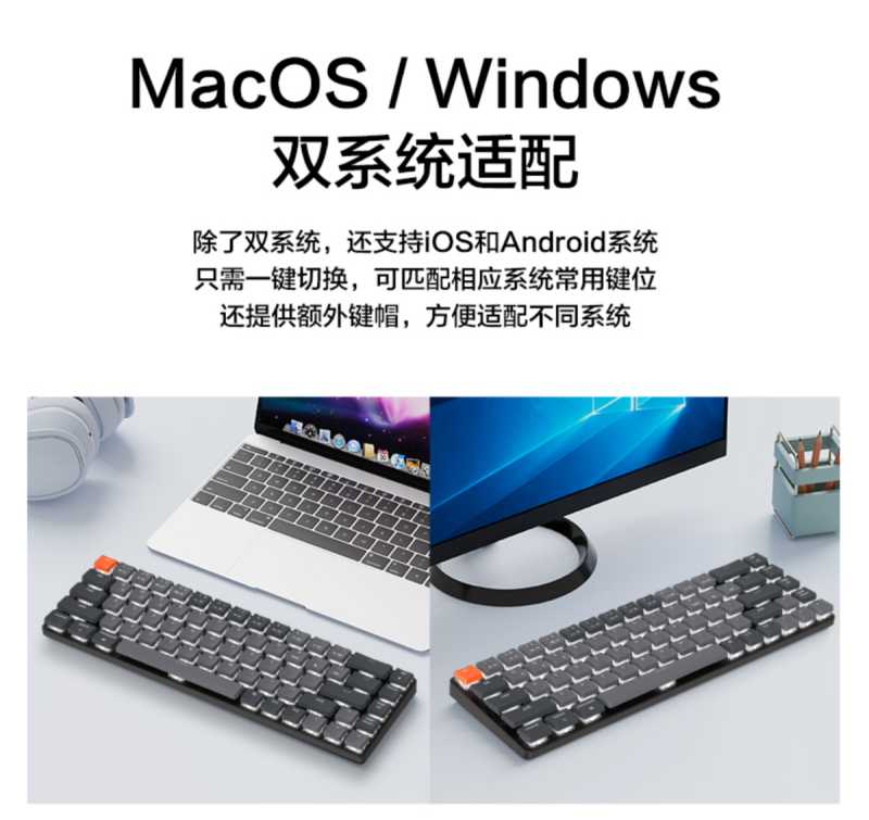 另一方面,在易用性方面,它也支持了蓝牙 5.1 和 Type-C 有线两种连接方式,还对 MacOS 和 Windows 双系统进行了适配(当然也支持 iOS 和 Android 等系统使用),并且还配有给予用户选择的替换键帽,能适应不同系统的办公环境,方便你第一时间熟悉这款键盘。