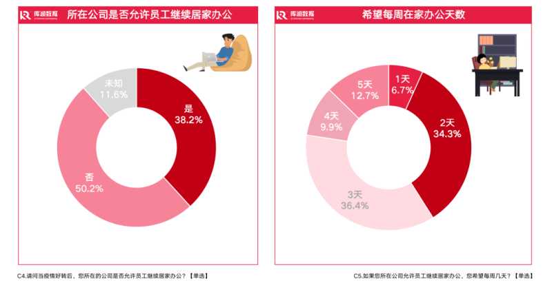 随着之后疫情好转,超过一半的人认为公司会要求员工正常办公,如果所在公司允许居家,他们希望每周2-3天为宜。