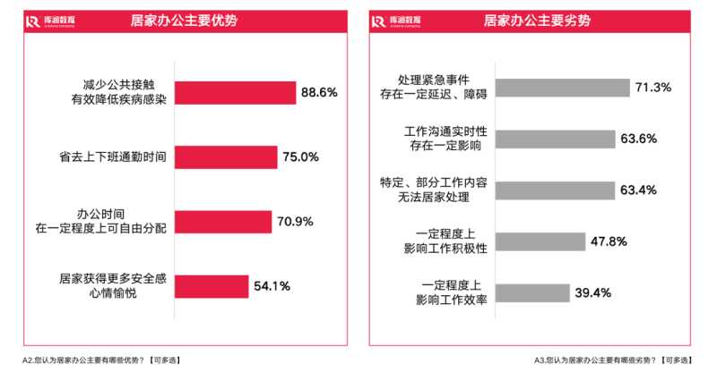 人们认为居家办公最大的优势是能一定程度减少公共接触,降低感染,其次是节省上下班通勤时间;